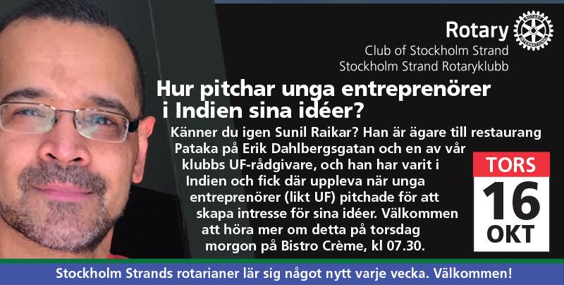 Välkommen till vårt möte på torsdag och lyssna till Sunil Raikar, själv företagare med restaurang berätta för oss om spirande företagsdrömmar i Indien. Välkommen